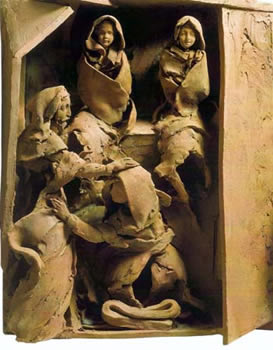G Maria di Magdala osserva la tomba vuota restando immobile nel suo dolore. Vive coraggiosa nell’aspetto, ma lacerata nel cuore. Ella rappresenta quell’umanità sofferente che, in lacrime, nella prova, nella malattia, nella tribolazione rimane impietrita dal dolore e dalla disperazione.